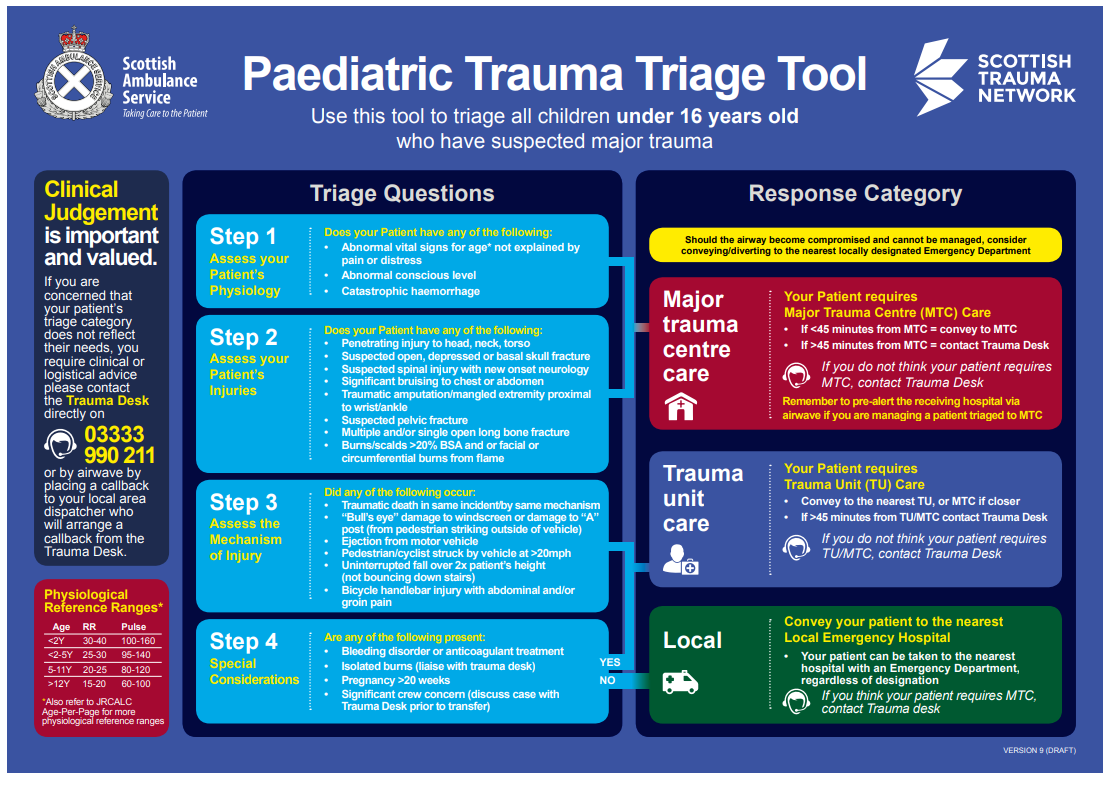 The PMTTT follows a similar format to the adult MTTT. Whilst the evidence is not as strong for the triage and care of the paediatric major trauma patients, the PMTTT has been developed by the STN Paediatric Group and thus is based on the expert opinion of the group. A UK National Institute of Health Research (NIHR) funded Major Trauma Triage Tool Study (MATTS) has commence research regarding the triage of paediatric major trauma patients, with input from the SAS Trauma Team and STN Paediatric colleagues.